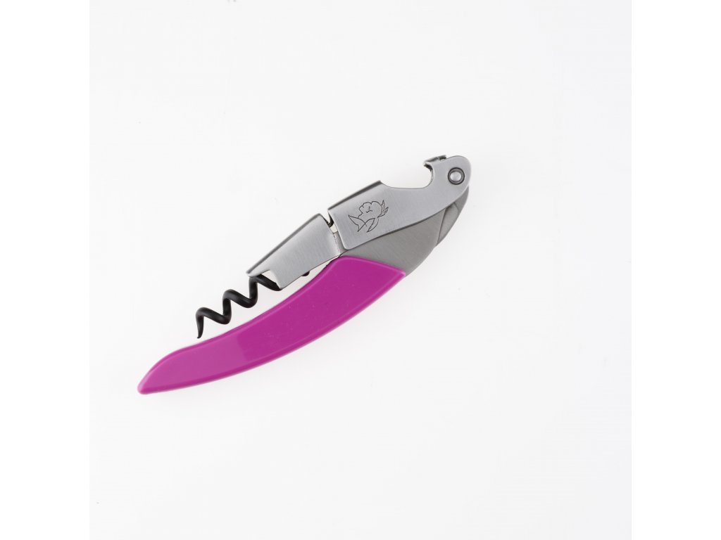 Vývrtka na víno vyrobená z kvalitní oceli s patentovaným dvojitým pákovým systémem pro profesionální sommeliéry, teflonovým hrotem a bytelným plastovým madlem z biologicky odbouratelných plastů ze škrobů v barvě magenta.